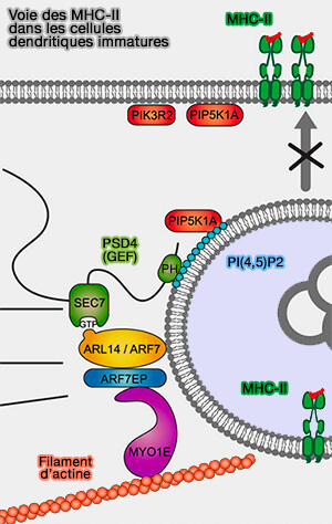Dans ces cellules, les MIIC sont maintenus dans la cellule par l'action de (A Genome-wide Multidimensional RNAi Screen Reveals Pathways Controlling MHC Class II Antigen Presentation 2011) :