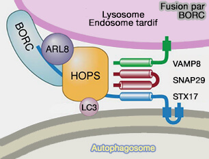 3. L'activation d'Arl8b par BORC favorise l'acquisition du complexe HOPS, processus montré pour les autolysosomes (BORC coordinates encounter and fusion of lysosomes with autophagosomes 2017).