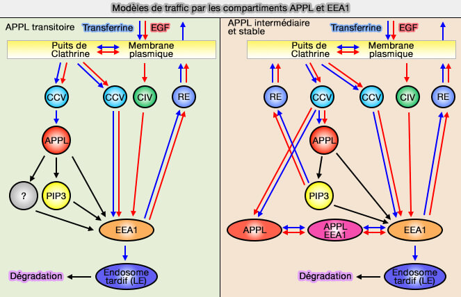 APPL1 se trouve dans des compartiments transitoires et très précoces dans la voie endocytaire, compartiments précurseurs des endosomes contenant EEA1 (Biochemical Characterization of APPL Endosomes: The Role of Annexin A2 in APPL Membrane Recruitment 2011).