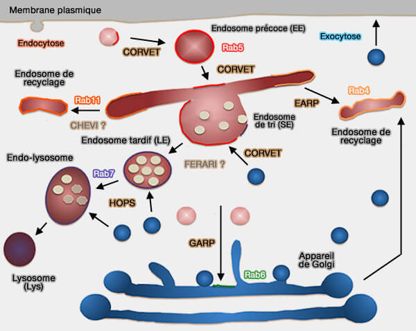 - des endosomes tardifs (Rab7 Regulates Late Endocytic Trafficking Downstream of Multivesicular Body Biogenesis and Cargo Sequestration 2009 et Rab Proteins and the Compartmentalization of the Endosomal System 2014),