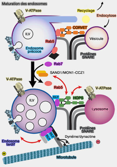 1. Les endosomes tardifs contiennent Rab7 (Ypt7 de la levure) à la place de Rab5 (Vps21 de la levure) des endosomes précoces, i.e. RAb5 est remplacé par Rab7 en seulement quelques minutes (Identification of the Switch in Early-to-Late Endosome Transition 2010).