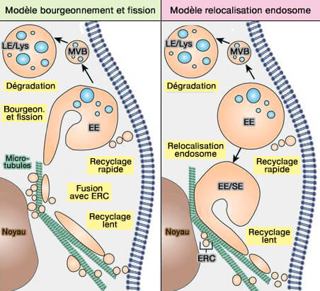 Selon le type cellulaire, les éléments endocytés atteignent les endosomes précoces 1 à 5 min après endocytose, puis les endosomes tardifs après 10 à 30 min, et enfin les compartiments lytiques après environ 30 min après l’endocytose.