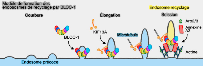 - relie peut-être les tubules membranaires au cytosquelette des microtubules, et favorise les réarrangements d'actine pour stabiliser et allonger les tubules (BLOC-1 Brings Together the Actin and Microtubule Cytoskeletons to Generate Recycling Endosomes 2016),