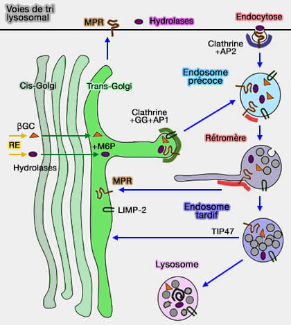 - Ces hydrolases phosphorylées sont reconnues par le récepteur du mannose 6-Phosphate (MPR) qui cible les lysosomes.