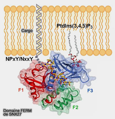 SNX27 interagit aussi avec de nombreux cargos au motif NPxY, par son domaine FERM.