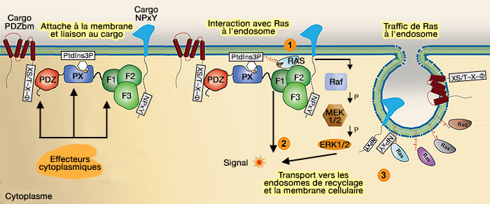 SNX27 interagit avec de nombreux cargos par son domaine PDZ et son domaine FERM, en vue de leur recyclage vers la membrane plasmique via le réseau de microtubules.
