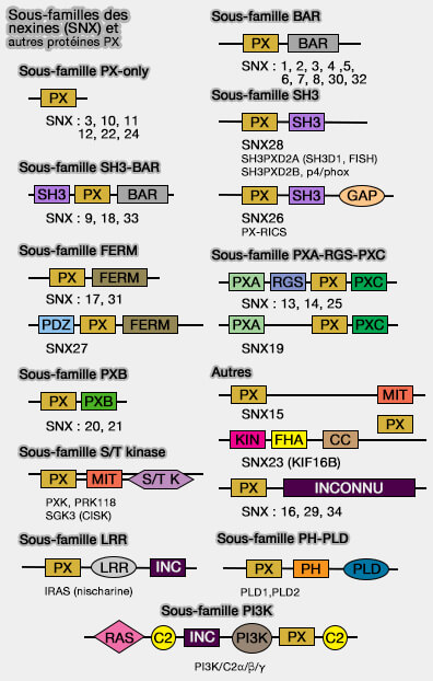 - SNX5, SNX6, i.e. équivalent à Vps17 de la levure.