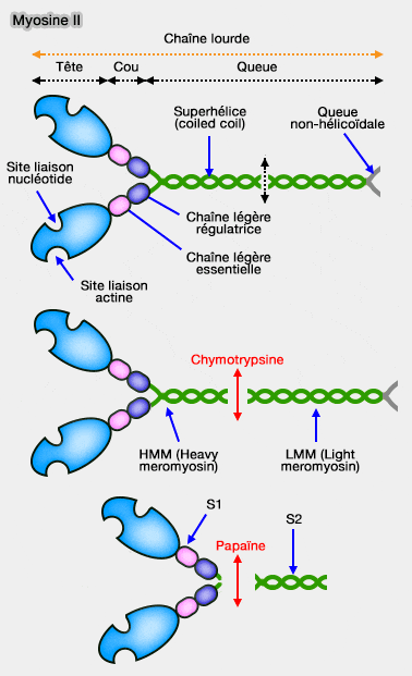 - la chymotrypsine (protéase douce) clive la myosine en méromyosine lourde (HMM : Heavy Meromyosin) et légère (LMM : Light Meromyosin).