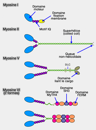 - Les myosines II, seules responsables des contractions, à nombreuses isoformes pour que la contraction soit individualisée selon son rôle dans les muscles (squelettiques, muscle cardiaque et muscles lisses) ou dans les cellules non-musculaires (motilité, migration cellulaire, adhésion et division cellulaire).