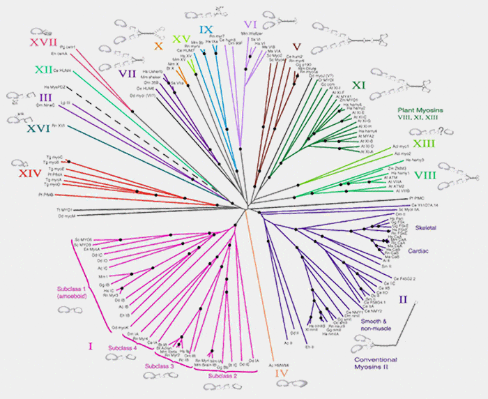 Remarque : Les myosines peuvent également être classées différemment selon leurs propriétés mécaniques et cinétiques (classification des moteurs).