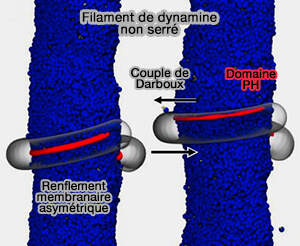 - Un filament non resserré reposant sur une membrane de rayon correspondant crée un couple de Darboux tangentiel sur la membrane, i.e. cadre de Darboux, une fois que la bande d'adhérence, i.e. les domaines PH, tourne, induisant un renflement asymétrique de la membrane.