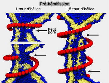 1. L'hémifission est un état intermédiaire où la monocouche proximale (également appelée monocouche de contact) de la bicouche formant le col fusionne, séparant ainsi le volume interne en deux parties, tandis que la monocouche distale reste continue (A hemi-fission intermediate links two mechanistically distinct stages of membrane fission 2015).