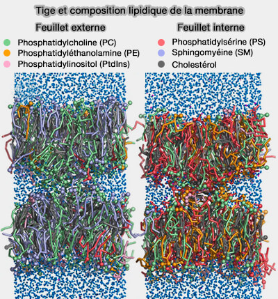 - le feuillet interne comprend plus de phosphatidyléthanolamine (PE), de phosphatidylsérine (PS) et de phosphatidylinositol (PtdIns).