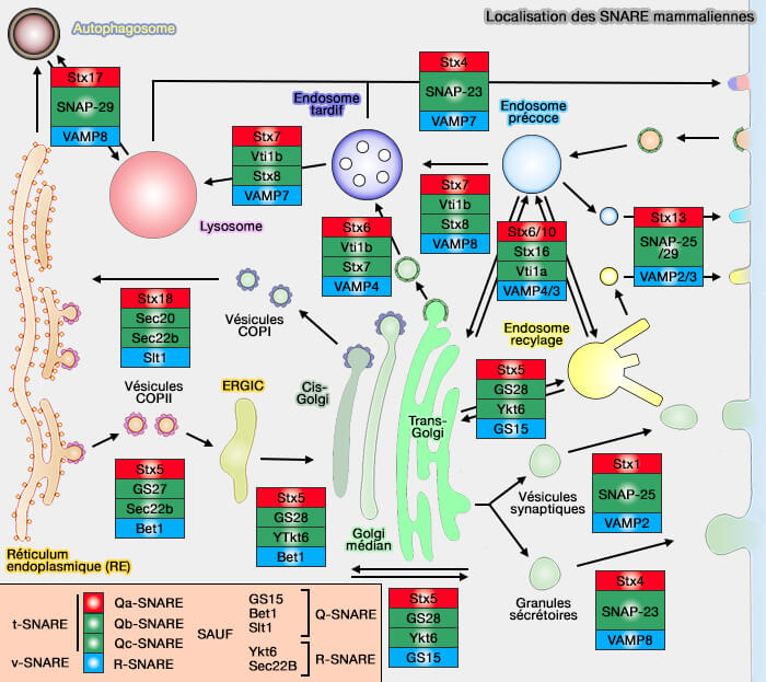 - les t-SNARE (t pour target, cible) qui sont pour la plupart des Q-SNARE (