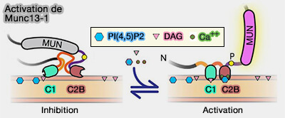 Munc13-1 est une protéine essentielle à la fusion des vésicules synaptiques (VS) et à la libération des neurotransmetteurs et à l'amarrage local des vésicules synaptiques (VS) dans les membranes présynaptiques (MP).
