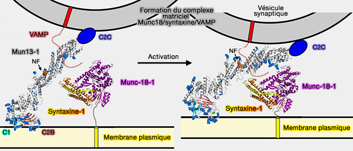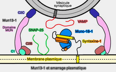 Cette interaction libère le domaine Hc de la syntaxine du complexe Munc18/syntaxine pour former le complexe ternaire syntaxine-1/SNAP-25/VAMP2 qui favorise la fusion des VS (Munc13 activates the Munc18‐1/syntaxin‐1 complex and enables Munc18‐1 to prime SNARE assembly 2020).