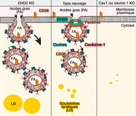 1. EHD2, comme les autres EHD, joue un rôle dans la formation des cavéoles en régulant négativement ce processus de bourgeonnement favorisé par le cholestérol ( cavéoline et cholestérol).