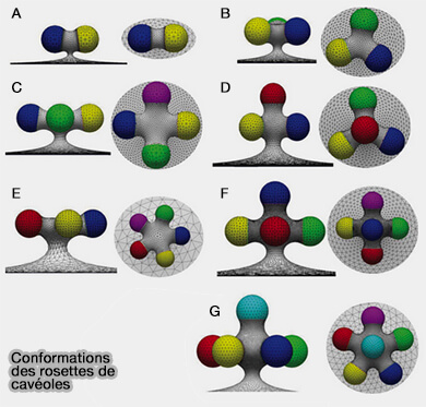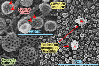 1. Cette morphologie permet facilement de les distinguer des cages de clathrine (100 nm), surtout que du côté intracellulaire, la membrane semble dépourvue de manteau protéique ou striée, contrairement aux cages de clathrine.