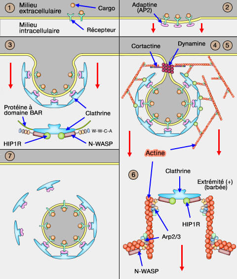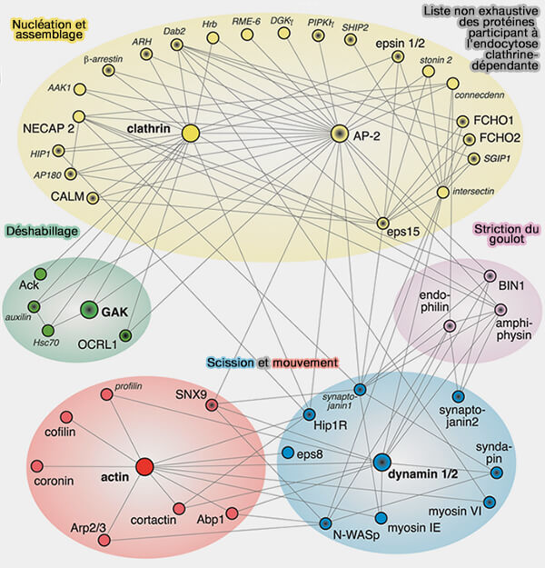 Toutes ces protéines se rassemblent du cytosol au site endocytaire de manière hautement ordonnée (A High Precision Survey of the Molecular Dynamics of Mammalian Clathrin-Mediated Endocytosis 2011).