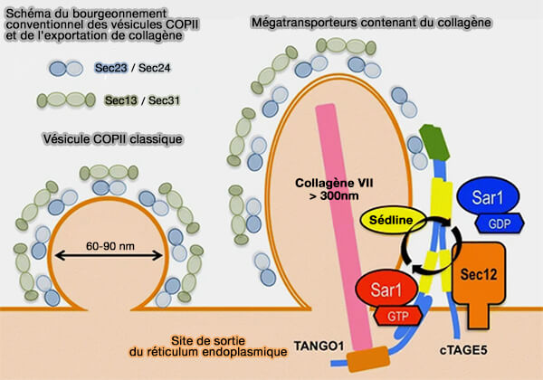 - La formation des mégabourgeons constitués d'un anneau de l'anneau COPII et d'un anneau plus externe de TANGO1 et montrant des taches positives au procollagène à l'intérieur de ces anneaux n'a pas été démontrée (malgré TANGO1 builds a machine for collagen export by recruiting and spatially organizing COPII, tethers and membranes 2018 et Auto-regulation of Secretory Flux by Sensing and Responding to the Folded Cargo Protein Load in the Endoplasmic Reticulum 2019).