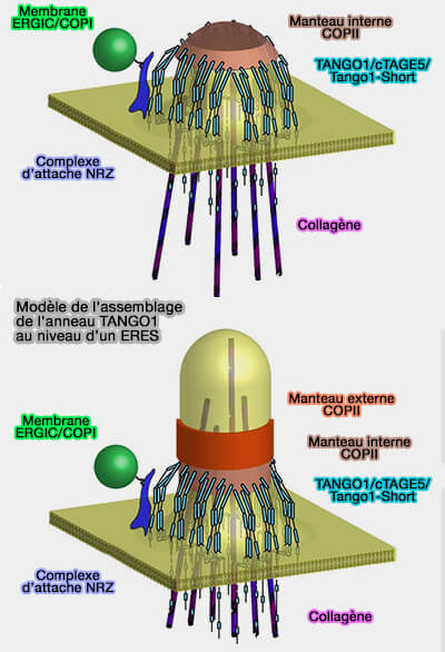 Remarque : Tango1 intervient dans la sortie des mégacargos comme le procollagène et pourrait former des canaux qui relient le RE au Golgi ( cf. KARM de l'EGT).