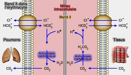 3. L'échangeur anionique Cl-/HCO3-, appelé AE1 ou band 3, joue un rôle important dans les érythrocytes (globules rouges) ou le rein.