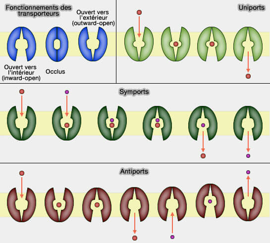Les antiports (échangeurs, antiporteurs ou contre-transport) déplacent les molécules et les ions dans les sens inverse.
