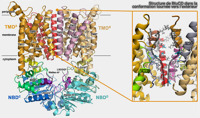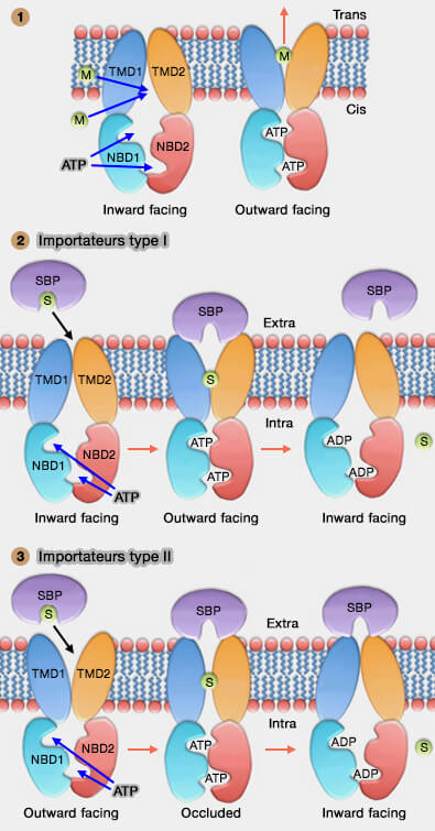 2. L'importateur de type II, orienté vers l'extérieur, i.e. BtuCD, le transporteur de la vitamine B12) se lie à la protéine de liaison au substrat (SBP) et à deux molécules de Mg++-ATP (The Conformational Transition Pathways of ATP-Binding Cassette Transporter BtuCD Revealed by Targeted Molecular Dynamics Simulation 2012).
