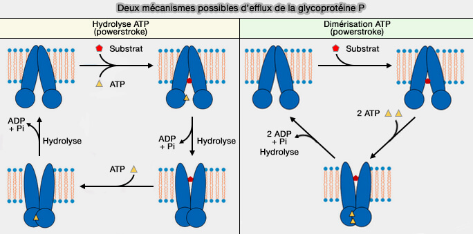 Remarque : il semblerait que le modèle du cycle de transport de la glycoprotéine P soit celui dans lequel la dimérisation des deux sites de liaison à l'ATP constitue le power stroke (Molecular structure of human P-glycoprotein in the ATP-bound, outward-facing conformation 2018).