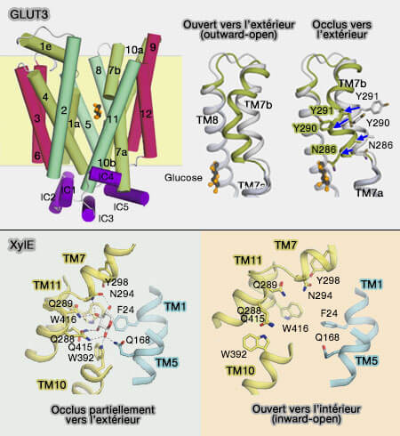 2. Dans GLUT3 (transporteur SLC2A3), l'uniport spécifique du transport du glucose dans les neurones, l'occlusion asymétrique vers l'extérieur est due à une flexion vers l'intérieur de la demi-hélice TM7b, située sur le faisceau C-terminal.