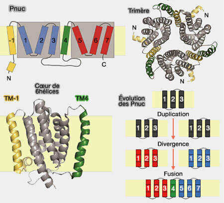 1. Chaque protomère est constitué de domaines transmembranaires, numérotés de -1 à 7, car le premier segment est absent de nombreux membres des PnuC et de tous les membres de la famille SWEET.