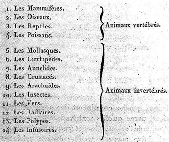 « Depuis plusieurs années je fais remarquer dans mes Leçons au Muséum, que la considération de la présence ou de l'absence d'une colonne vertébrale dans le corps des animaux, partage tout le règne animal en deux grandes coupes très distinguées l'une de l'autre, et que l'on peut en quelque sorte considérer comme deux grandes familles du premier ordre. Je crois être le premier qui ait établi cette distinction importante, à laquelle il paroît qu'aucun Naturaliste n'avoit pensé. Elle est maintenant adoptée par plusieurs qui l'introduisent dans leurs ouvrages ainsi que quelques autres de mes observations, sans en indiquer la source. Tous les animaux connus peuvent donc être distingués d'une manière remarquable. 1°. En animaux à vertèbres. 2°. En animaux sans vertèbres. » Discours d'ouverture prononcé le 21 floréal an 8 (publié en introduction au Système des animaux sans vertèbres) p : 6 et suivantes