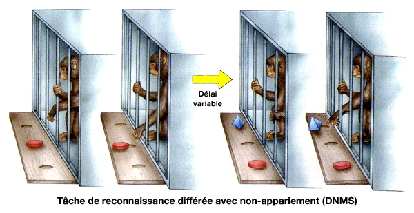 Des expériences de reconnaissance différée chez le macaque ont permis de montrer le rôle des lobes préfrontaux dans la mémorisation des tâches visuelles.