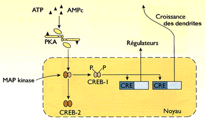 - Le CREB se fixe sur le CRE (cAMP response élément) de l'ADN, qui contient la séquence nucléotidique hautement conservée, 5'-TGACGTCA-3', pour activer les gènes permettant la fabrication de nouveaux récepteurs AMPA (La biologie moléculaire de la mémoire: un dialogue entre gènes et synapses 2000).