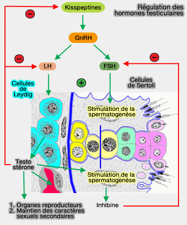 Chez le mâle, la LH stimule la production de testostérone par l'intermédiaire des cellules de Leydig pour la maintenir à un taux élevé dans les testicules.