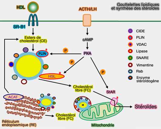 b. Il peut être également synthétisé dans les cellules stéroïdiennes et être utilisé lors de déstockage des gouttelettes lipidiques (LD ou Lipid Droplet), riches en esters de cholestérol (CE), grâce à la HSL (Hormone-Sensitive lipase) qui produit du cholestérol libre (FC).
