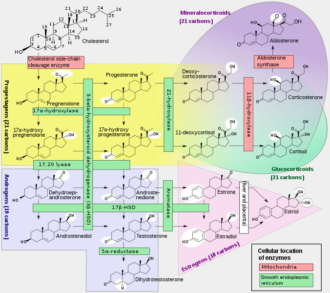 - 21 carbones (C21), progestérone (progestagènes), cortisol (glucocorticoïdes), aldostérone (minéralocorticoïdes) ;