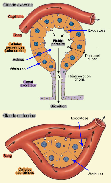 un ou plusieurs canaux excréteurs qui déversent leurs sécrétions à la surface du corps comme l'épiderme, ou dans des organes creux en communication avec l'extérieur (muqueuses).