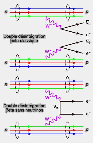 Certains noyaux peuvent, avec une probabilité très faible (1 en 1024 ans), la subir deux fois (double désintégration bêta (β) : ββ2ν) et ainsi produire 2 antineutrinos, ce qui a été démontré par l'expérience NEMO (Neutrino Ettore Majorana Observatory).