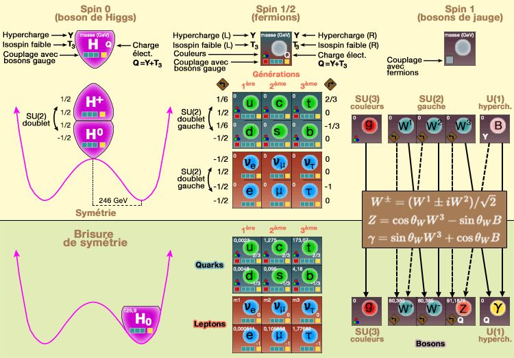 Le modèle standard de la physique des particules est une théorie quantique des champs de jauge contenant les symétries internes du groupe de produits unitaire $SU(3)\times SU(2)\times U(1)$, considérée comme contenir l'ensemble des particules (quarks, leptons, bosons de jauge et boson de Higgs).