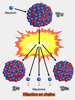 2. un dégagement d'énergie très important, environ 200 MeV par atome fissionné contre quelques eV seulement lors de réactions chimiques ;