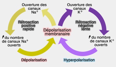 b. L'existence du seuil de déclenchement du potentiel d'action pose un problème et montre que la perméabilité au sodium est dépendante du potentiel membranaire : on assiste à une rétroaction positive ou rétroactivation, appelée cycle de Hodgkin qui est voltage-dépendant.