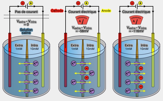 Toutefois, on peut prédire que si, pour une raison quelconque, la membrane devient perméable à un de ces ions, le potentiel de membrane aura tendance à tendre vers une de ces valeurs.