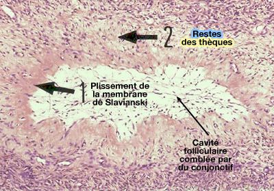 - Lors de l'involution des follicules pré-antraux et antraux (follicules thécogènes), leur thèque interne peut persister un certain temps et former la glande interstitielle de l'ovaire sécrétant des androgènes. Les plus gros laissent des cicatrices dans le stroma ovarien.