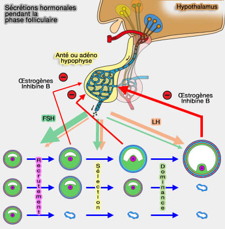 En effet, la sécrétion croissante d'oestrogènes pendant la phase terminale a pour effet de diminuer le taux de FSH qui devient trop faible pour :