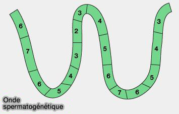 Grossièrement, on retrouve des cellules au même stade d'évolution, de manière répétitive le long des tubes séminifères dans l'ordre numérique des stades du cycle qui s'éloigne de chaque côté d'un point hypothétique.