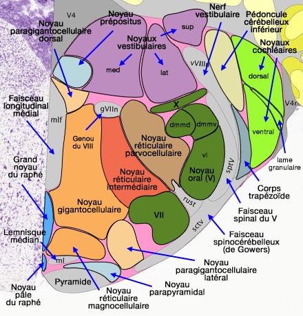 Ces noyaux possèdent un grand nombre de cellules neuronales particulières (jusqu'à une cinquantaine) selon leur morphologie, leur taille, leur connectivité…