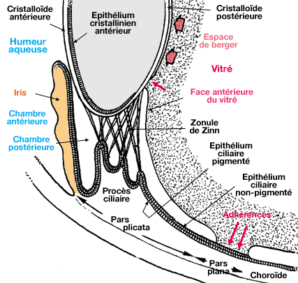 Le muscle ciliaire est un petit muscle en anneau. Il se contracte comme un sphincter et modifie la courbure du cristallin grâce à des fibres situées sur les procès ciliaires et fixées sur le pourtour du cristallin (zonule de Zinn qui ressemble à une roue de bicyclette avec ses rayons).