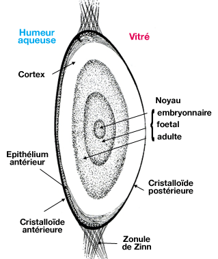 Le cristallin est constitué de fibres cristalliniennes qui vont d'une face à l'autre du cristallin, où leurs extrémités dessinent les rayons du cristallin (un peu comme des pelures d'oignon).