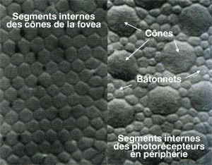 Ces photorécepteurs font partie du système photopique (en grec, photos, lumière) : il permettent la vision des couleurs et détectent également les formes.